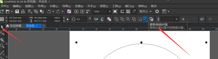 第五步,选择左侧工具栏中的选择工具,按住键盘上的快捷键“shift”键并以此选择黑色线条和白色的圆。这里要注意,这个选择顺序很重要。然后点击上面属性栏中的移除前面对象,那条粗粗的黑色线条就会被移除了。