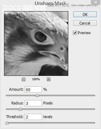 选择滤镜 Filter 菜单下的 锐化 Sharpen 子菜单里面的Unsharp Mask (不同版本的Photoshop名字有所不同)。这里使用风光户外的常用参数:数量65%,半径:3像素和阀值2级。