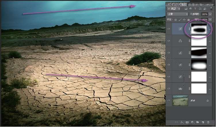 工具箱中选画笔,设置前景色为白,上面选项栏设置很大的笔刷直径和最低的硬度参数。用白色画笔把地面中间部分涂抹出来,干涸的地面感觉强烈了。