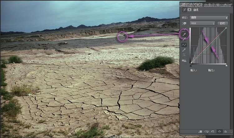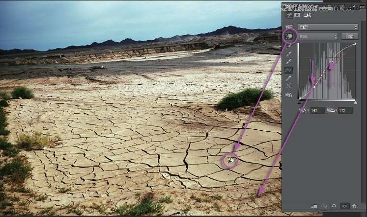 在弹出的曲线面板中先将曲线右上角的最亮点向下移动。然后选直接调整工具,在干涸地面最亮的地方按住鼠标向下移动,把近处的地面也向下压,现在整个影调都暗下来了。
