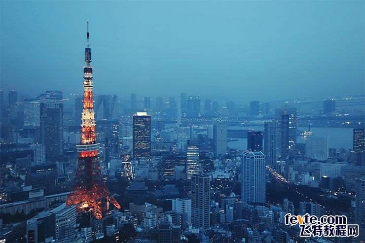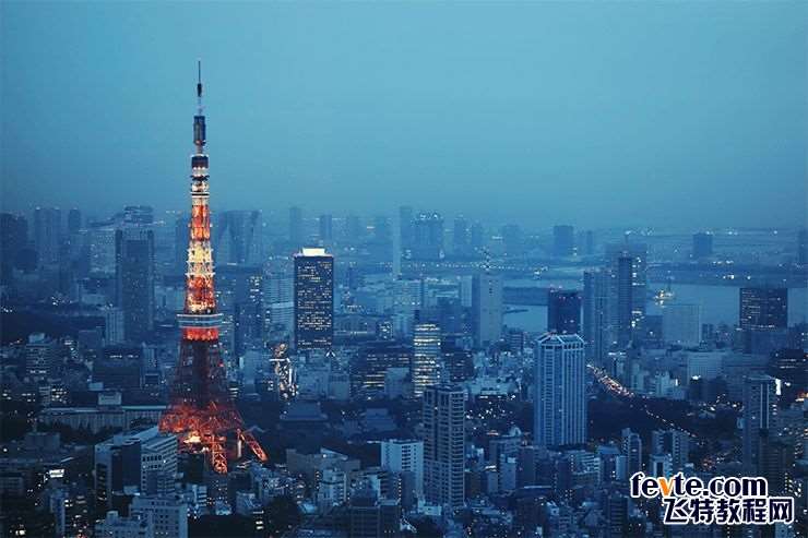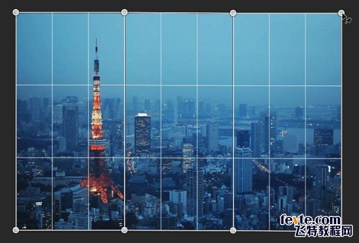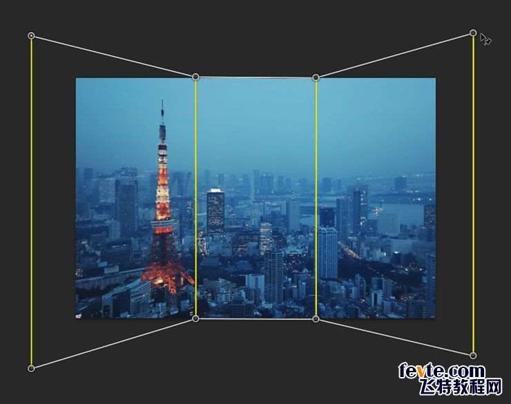 透视变形工具其中一个有趣的用途是将远景拍摄效果转换为广角效果。这里使用的是日本东京铁塔的风景照。首先用透视变形工具将照片划分为3个网格。