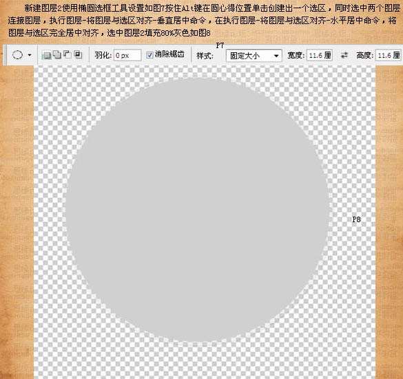 5、新建图层2,选择椭圆选框工具,数值设置下图上。按住Alt 键在圆心位置单击创建一个选区,同时选中两个图层链接图层,执行:图层 > 将图层与选区对齐 > 垂直居中命令,再执行:图层 > 将突出于选区对齐 > 水平居中命令,将图层与选区完全居中对齐,选中图层2填充80%灰色,效果如下图。