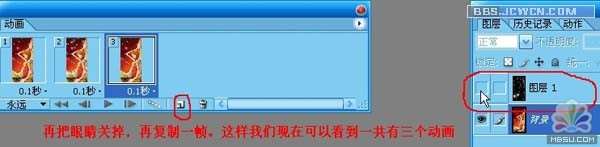 8.再把眼睛关掉,复制再复制一个帧.那么我们现在可以看到三个动画了
