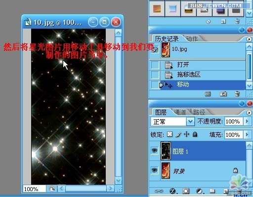 3.选择星光图片,Ctrl a(全选),用移动工具把星光图片移动到要设计的图片当中