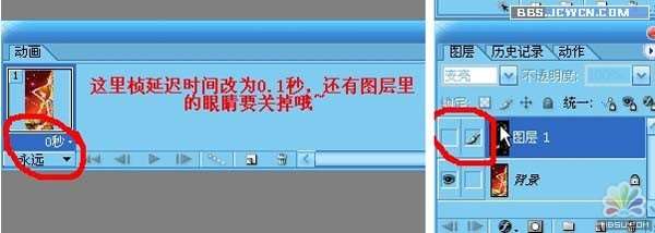 6.关掉图层1的眼睛,将帧的参数设置为1.1秒
