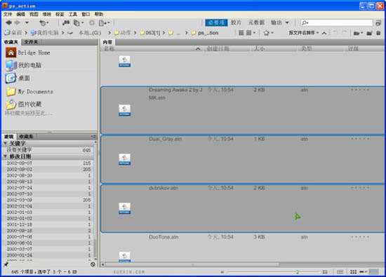 如希望一次性添加多个动作集,可在Windows中选择多个AIN文件拖入Photoshop;也可以在Bridge中选择多个AIN文件并双击。