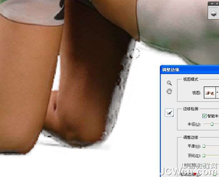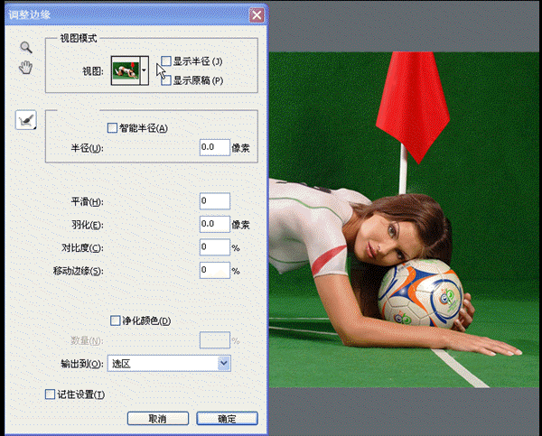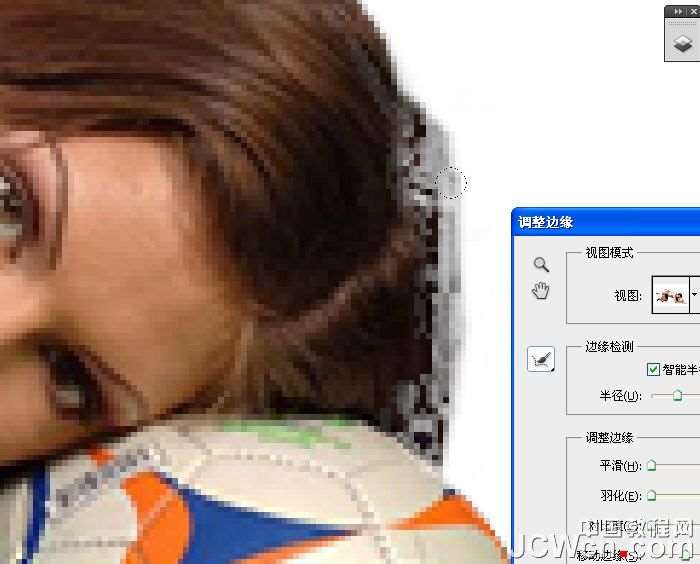 通过观察,半径值小时,它的变化并不明显,半径值加大后可以看到选区边缘显示的区域不再平滑而透明度的变化貌似和颜色有关(?)。但,选区内部却保护的更为完整了。结合使用“调整边缘”复选框内的各选项,可实时调整边缘细节。