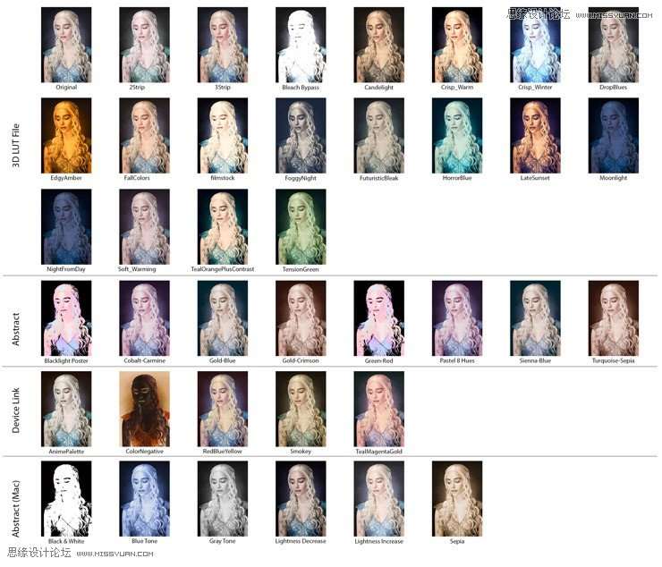 注意:Mac系统包括6个摘要配置文件(黑与白,蓝色调,灰色调,亮度减少,亮度增加,以及深褐色)。在“LUTimage_replace.psd”图像中这些配置文件显示在最后一行。但Windows用户看不到也将无法使用。SO,如果你还在抱怨没有安装CS6的话,是不是顺便也可以换一台苹果电脑呢? 哈哈,