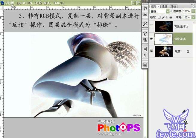 3.选择菜单:图像 模式 RGB颜色,选择不要拼合图层,然后按Ctrl J 复制一层,回到背景副本如图3所示,按Ctrl I反相,然后把图层混合模式改为:“排除”