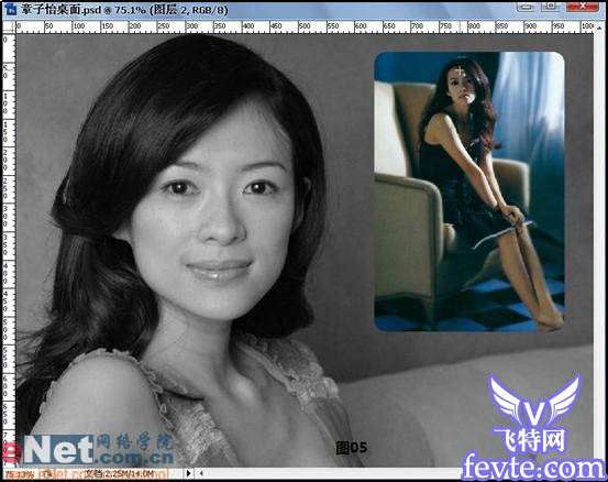 第三步:再次打开一张章子怡的图片,并将其拖入【章子怡桌面】,系统自动为其命名为【图层二】,按【Ctrl】 【T】键,调整【图层二】的大小及位置,效果如【图03】所示。
