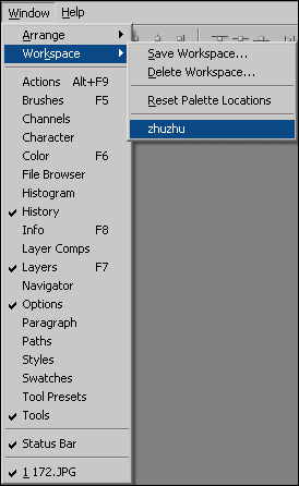 13.自定义的工作空间命名会出现在Workspace的菜单中,以后就算面板弄乱了,一个菜单命令就可以轻松恢复。如果需要使用默认的界面安排可以选择Reset Palette Locations(复位面板位置)的命令。