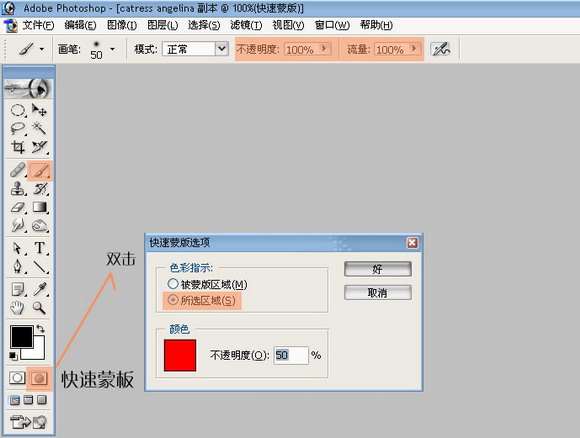 首先,作一下准备工作。在这里主要是使用快速蒙板,主要一下快速蒙板的设置。