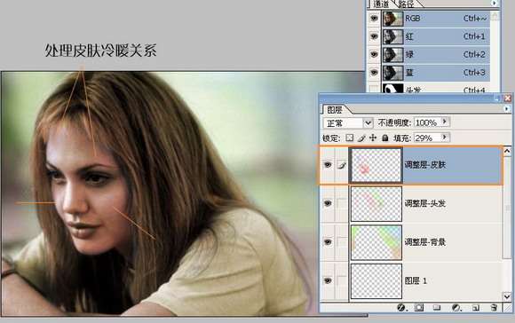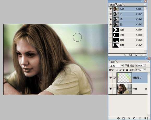 用纯黑色画出头发的选区,在一些边缘的地方由于头发比较稀少,可以适当减小不透明度。