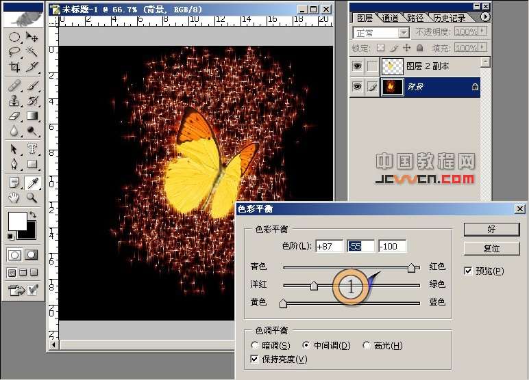 9旋转回画布,执行[图像],[调整],[色彩平衡]调到你喜爱的颜色,显示一直隐藏的蝴蝶