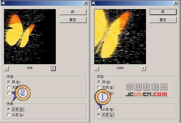 7在合并图层中,执行[滤镜],[风格化],[风]先左在右。