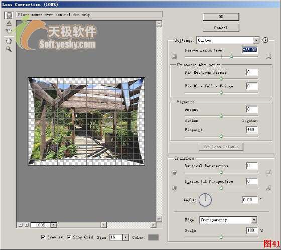 第二步:选择菜单命令“Filter”→“Distort”→“Lens Correction”(滤镜→扭曲镜头→校正),打开镜头校正对话框。 第三步:根据需要作调整。在这里将“Remove Distortion”(移除变形)值设置为28,观察预览图的变化,如图41所示。网格可以帮助我们观察校正变形的效果。