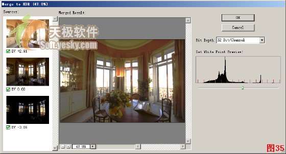 第四步:在接下来出现的“Merge to HDR”对话框中左侧可以再次选择要使用的源图片。源图片至少需要三个。注意如果要将图像保存为HDR图像一定要在右侧的“Bit Depth”列表中选择“32 Bits/Channel”。单击OK按钮。