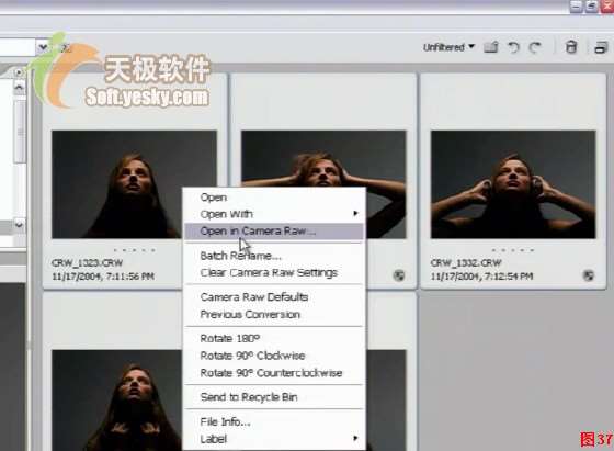 现在的许多数码相机除了能够将图像存储为JPEG、TIFF格式之外,还能存储为RAW格式。其实RAW并非一种图像格式,而是相机的CCD或CMOS在将光信号转换为电信号时的电平高低的原始记录,单纯地将数码相机内部没有进行任何处理的图像数据,即CCD等摄影元件直接得到的电信号进行数字化处理而得到的。比如,对于300万像素的数码相机,一个RAW文件保存了300万个点的感光数据。而我们平常使用JPEG格式拍摄时,是数码相机在RAW格式基础上,在数码相机内部添加白平衡和饱和度等参数,然后生成图像数据、进行压缩处理。 数码相机附带的RAW数据处理软件能够将RAW数据转换成TIFF等普通图像数据,用户在处理时可以任意设置白平衡、锐度、对比度等参数,这样一来,用户就能创作自己喜欢的图像了。处理RAW格式图像数据与处理JPEG图像不同的是,图像数据不会有画质恶化的情况发生。 必须有一款支持RAW格式的相机,才能创建RAW格式文件,需要在拍摄之前将相机设置为保存为RAW格式。在Adobe Bridge和Photoshop中,只能处理它们所支持的数码相机,在这里可查看支持的相机列表。 在Photoshop,可以直接打开RAW文件。在Bridge中,浏览到要处理的RAW格式文件,如图37所示,选中一个或多个RAW文件后,在上面单击右键,然后选择“Open in Camera Raw”(也可以使用菜单“File”→“Open in Camera Raw”)。