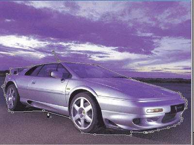 17、再使用工具箱中的“添加瞄点”工具来将路径进一步细化,使它与汽车的轮廓相吻合,接着按住键盘上的“Ctrl”键单击路径面板上、你前面刚才所描绘的“工作路径”,这样就能使工作路径转换为选择区域了;
